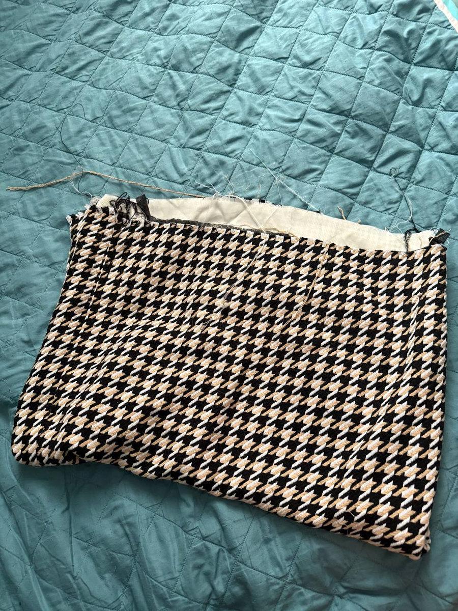 Ткань я, девочки, покупала в местном магазине. Это был твид с узором "гусиной лапки" – просто мечта! Как только увидела, сразу влюбилась. Такая плотная, благородная, цвет шикарный – серый с чёрным, идеальный для классического костюма. Подумала, что для себя любимой уж точно не стоит жалеть. Сложная ткань, конечно, но ведь профессионалу такое по плечу, верно? И с такой мыслью я её и купила. Но я поняла, что с такой капризной тканью лично у меня не получится работать, зато портной я была готова даже переплатить за работу. Купила вискозную подкладку с такой же "лапкой". Девочки, "гусиная лапка"! Это же мечта – твид с крупным рисунком. Ткань, в общем-то недорогая, вообще это 100% синтетика, но сердцу не прикажешь!