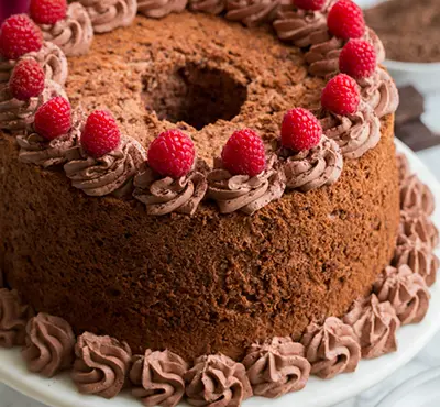 Шоколадный торт «Ангельское угощение» - божественный торт, лёгкий, как воздух, с нотками какао, с кусочками тёмного шоколада и взбитыми шоколадными сливками с добавлением красных ягод по желанию. Его приготовить проще, чем вы думаете. Это восхитительный праздничный торт на день рождения. Порадуйте себя и свою семью. Вот рецепт шоколадного торта. Для приготовления нам будут нужны вот эти продукты: 300 г сахарного песка 94 г муки 25 г какао-порошка 1/2 чайная ложка соли 12 крупных яичных белков комнатной температуры три столовых ложки воды 1,5 ч. л. винного камня 1,5 ч. ложки ванильного экстракта 60 г темного шоколада, тертого. Шоколадный взбитый топпинг: 400 мл жирных сливок 200 г сахарной пудры 25 г какао-порошка 1 ч. л. ванильного экстракта Малина или клубника для украшения (по желанию). Время приготовления: 2 часа. Все нужные продукты собраны. Теперь сам пошаговый рецепт шоколадного торта. 1. Переставьте решётку духовки на один уровень ниже центра и разогрейте духовку до 180 градусов