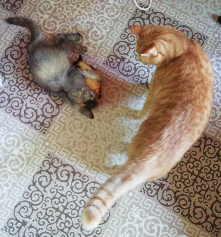 Гелла схватила крысу, мотнула головой и подбросила ее к потолку. Пока крыса взлетала, кошка успела легко оттолкнуться задними лапами и подпрыгнуть настолько высоко, чтобы поймать уже падающую крысу зубами в полете. Так же мягко приземлившись, почти на то же место, с которого прыгала, Гелла гордо повернула голову, с торчащей поперек пасти крысой, ко мне.