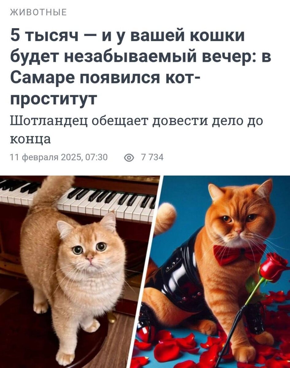 В Самаре нашелся настоящий кошачий Казанова — породистый шотландец, который предлагает свои услуги в качестве эскорта для кошек. За 5000 рублей этот пушистый джентльмен готов стать идеальным спутником для любой усатой дамы. Этот кот — настоящий Тигрище, золотая шиншилла, чья роскошная шерсть и харизма покорили сердца всех самарских кошечек. В объявлении говорится, что он знает своё дело на отлично и способен очаровать даже самую привередливую даму. Однако, чтобы стать его избранницей, кошкам придётся соответствовать строгим требованиям: обязательны все прививки, ухоженные когти, собственный лоток и корм премиум-класса. Ведь этот аристократ привык к комфорту и высоким стандартам.