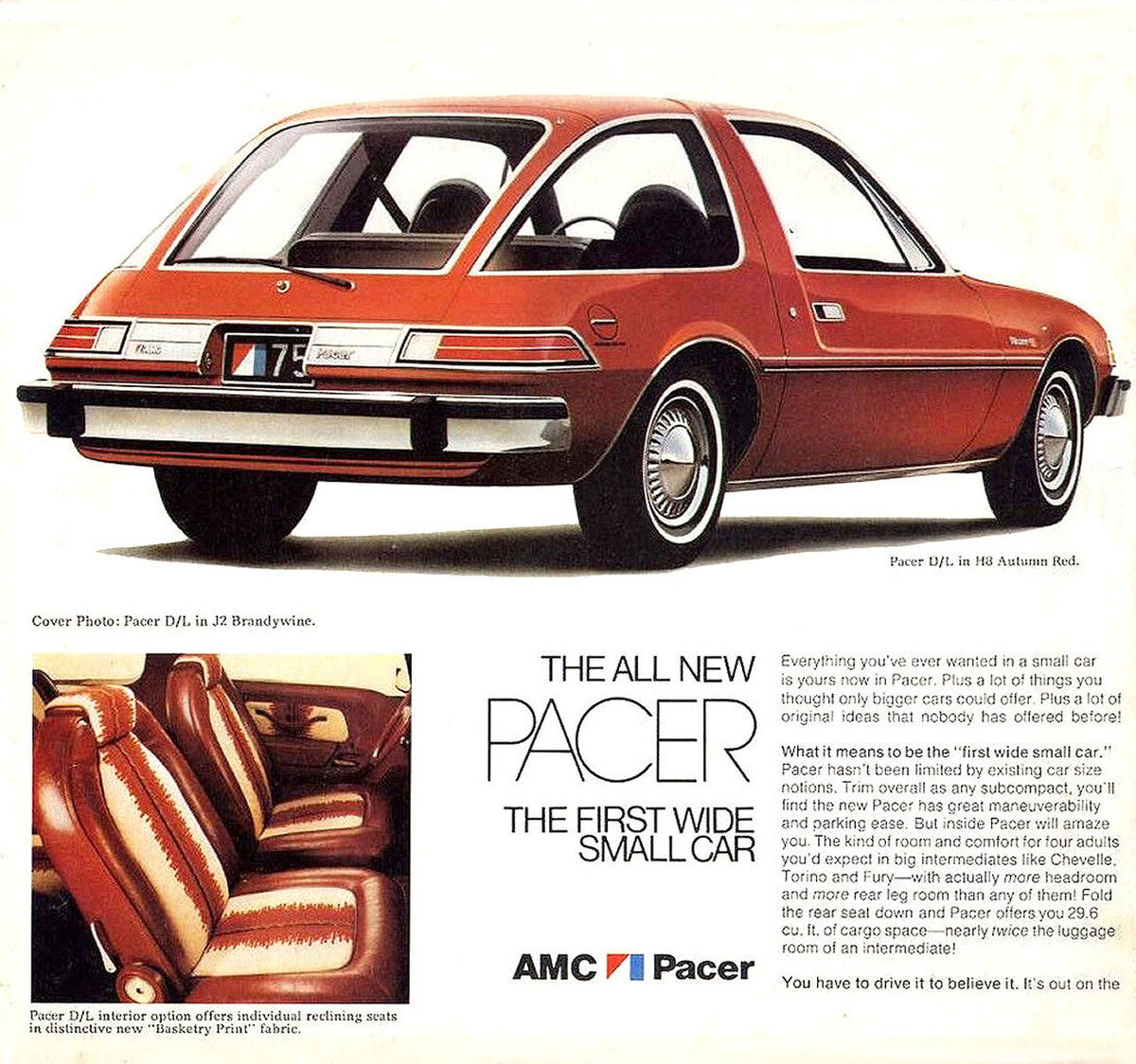 Топливный кризис начала 1970-х, стремительный рост популярности японских машин в США, «heavy traffic» - пробки в городах и сокращение количества парковочных мест, заставили американских производителей заняться разработкой компактных автомобилей. Откровенно говоря, получалось у них не очень… Отличным примером компактного американского автомобиля является AMC Pacer, выпускавшийся с 1975 по 1980 год. Когда Pacer был представлен публике, его поспешили назвать автомобилем XXI века – стиль радикально отличался от прямоугольных коробок автомобилей 70-х годов. Время было печальное для американского автопрома и на фоне унылых конкурентов, смотрелся Pacer достаточно интересно. Рекламировался AMC Pacer как «первый широкий компактный автомобиль», поскольку по ширине кузова не уступал полноразмерным машинам. Инженеры AMC применили инновационный подход, автомобиль проектировали как-бы изнутри. Сначала спроектировали просторный четырёхместный салон (насколько это было возможно в заданных габаритах),