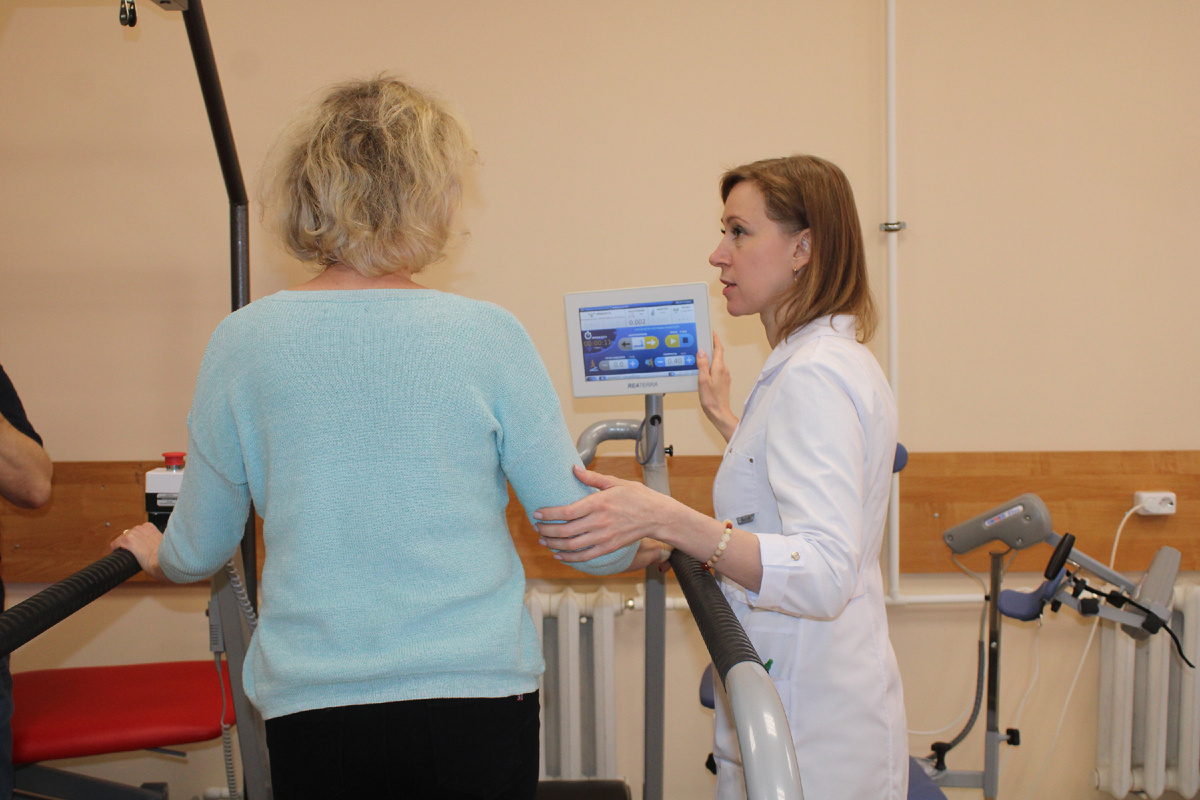 В ход пошло все оснащение отделения, все навыки и умения специалистов – ей делали массаж, проводили мышечную стимуляцию, в том числе аппаратную, физиотерапию, использовали систему «Корвит» с биологически обратной связью, разработанную для космонавтов. Она позволяет ускорить процесс восстановления после продолжительного периода неподвижности и помогает «вспомнить» организму, как ходить. Плюс обязательная вертикализация – специальный мобильный аппарат подвозили к кровати пациентки. Учитывая ее возраст и отсутствие хронических патологий, вертикализация проходила мягко и быстро. Следом подключили уже робот-вертикализатор, который прочно фиксирует пациента, поднимает, а нижняя часть конструкции, напоминающая обувь, ходит как бы за него, позволяя разбудить мышечную память. Занимались на различных тренажерах, которые мягко, но настойчиво разрабатывают суставы, возвращая подвижность конечностям.