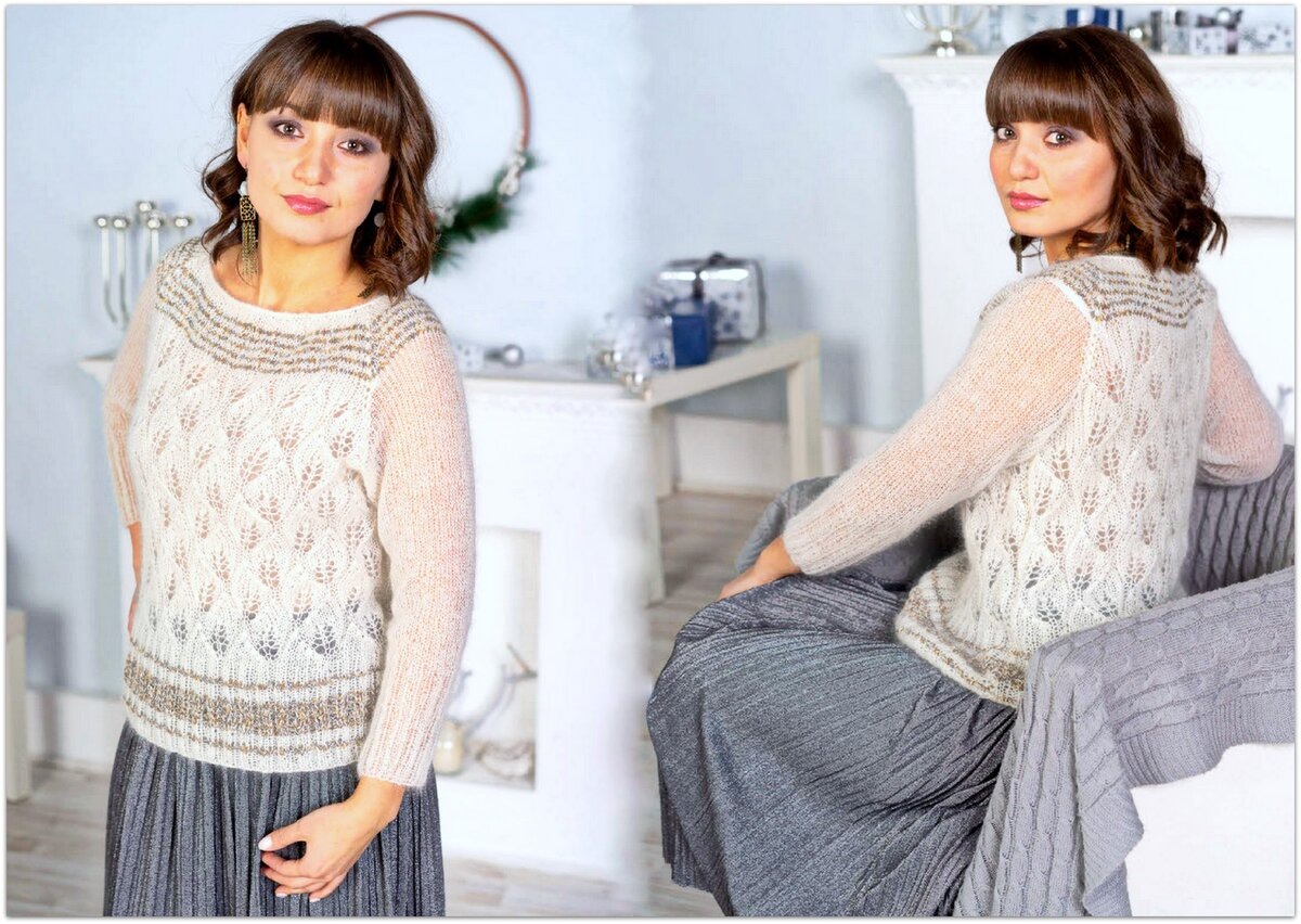 Невесомый пуловер-паутинка с невероятно эффектным узором, который шикарно смотрится на тонкой пряже с «пушинкой».