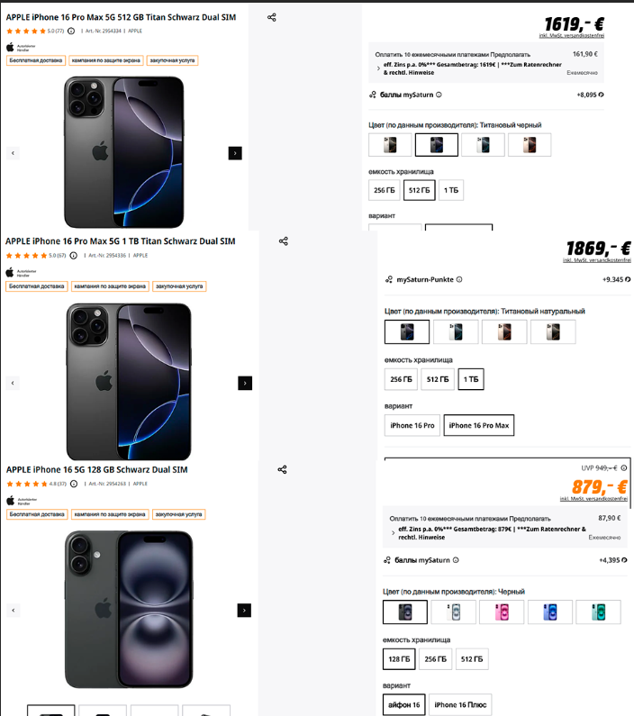 Технологии вокруг нас дорожают. Ещё недавно самый продвинутый смартфон стоил 600 долларов, ну а сегодня производители поражают воображение пользователей устройствами, цены на которые стартуют с 3000 долларов. Поразительно, но даже такая высокая стоимость не останавливает покупателей, а в итоге несколько миллионов аппаратов расходятся за считанные минуты. Спрос на продукцию, сильно отличающуюся от привычных моделей, постоянно растёт, ну а на этом фоне производители продолжают повышать цены. Если вы обратите внимание на скриншоты ниже, то сможете увидеть, сколько сегодня просят за iPhone 16 в Германии. Была взята для примера сеть Сатурн, которая считается одной из крупнейших в стране. Добавим, что в Польше немного дешевле, тогда как в Британии придётся доплатить ещё пару сотен фунтов.