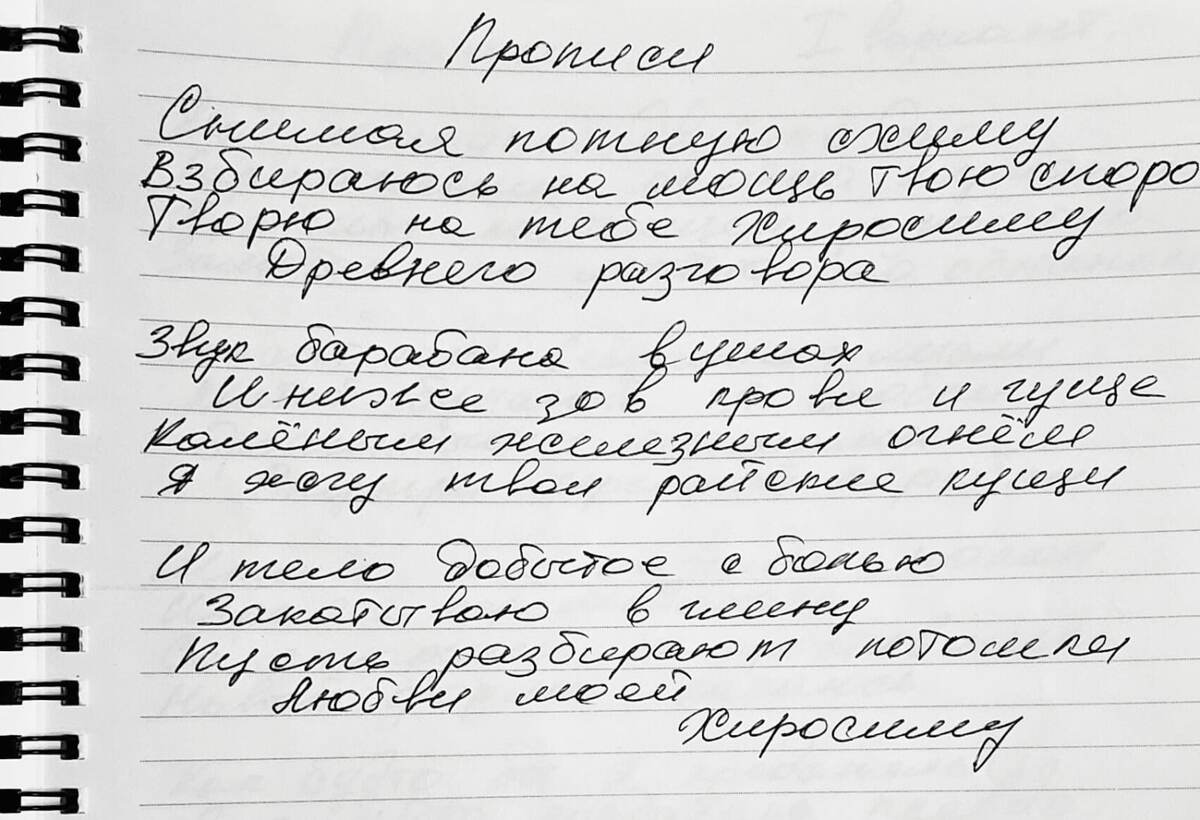 Снимая потную схиму Взбираюсь на мощь твою споро Творю на тебе хиросиму Древнего разговора _________________ Звук барабана в ушах И ниже зов крови и гуще Каленым железным огнем Я жгу твои райские кущи ___________________ И тело добытое с болью Закатываю в глину Пусть разбирают потомки Любви моей Хиросиму
