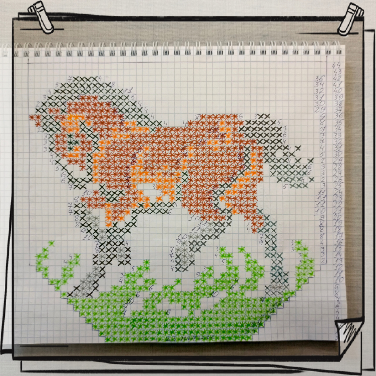 1ряд-Набираем косичку из 23 петель. 2,3,4 ряды-вяжем зелёной нитью с прибавками до 29 петель. 5ряд-12 зел.1 осн.1 зел.3 осн.6 зел.1 осн.7 зел. с приб. 6ряд-11 зел.2 осн.3 зел.4 осн.2 зел.3 осн.8 зел. с приб. 7ряд-11 зел.3 осн.5 зел.1 осн.3 зел.2 осн.10 зел. с приб. 8ряд-2 зел.3 чёрн.3 осн.3 зел.2 осн.10 зел.2 осн.6 зел.1 осн.1 чёрн.2 сер.1 чёрн.1 зел. с приб. 9ряд-1 зел.1 осн.1 чёрн.2 сер.1 чёрн.1 осн.3 зел.1 осн.6 зел.3 осн.2 зел.2 осн.6 зел.2 осн.1 чёрн.2 сер.1 чёрн.2 осн.1 зел. с приб. 10ряд-2 зел.1 осн.3 чёрн.2 осн.2 зел.1 осн.4 зел.1 осн.2 зел.2 осн.1 зел.3 осн.2 зел.1 осн.2 зел.4 осн.1 чёрн.2 сер.2 осн.3 зел. с приб. 11ряд-3 зел.1 осн.3 чёрн.1 осн.2 зел.2 осн.3 зел.1 осн.2 зел.9 осн.3 зел.3 осн.1 чёрн.2 сер.2 осн.2 зел.2 осн.1 зел. с приб. 12ряд-1 осн.3 зел.2 осн.2 чёрн.1 осн.3 зел.1 осн.2 зел.2 осн.1 зел.3 осн.2 чёрн.4 осн.2 зел.5 осн.1 чёрн.1 сер.3 осн.2 зел.2 осн.2 зел. с приб. 13ряд-2 осн.2 зел.3 осн.2 чёрн.2 осн.2 зел.2 осн.1 зел.5 осн.1 чёрн.1 сер.1 чёрн.4 осн.1 зел.2 осн.2