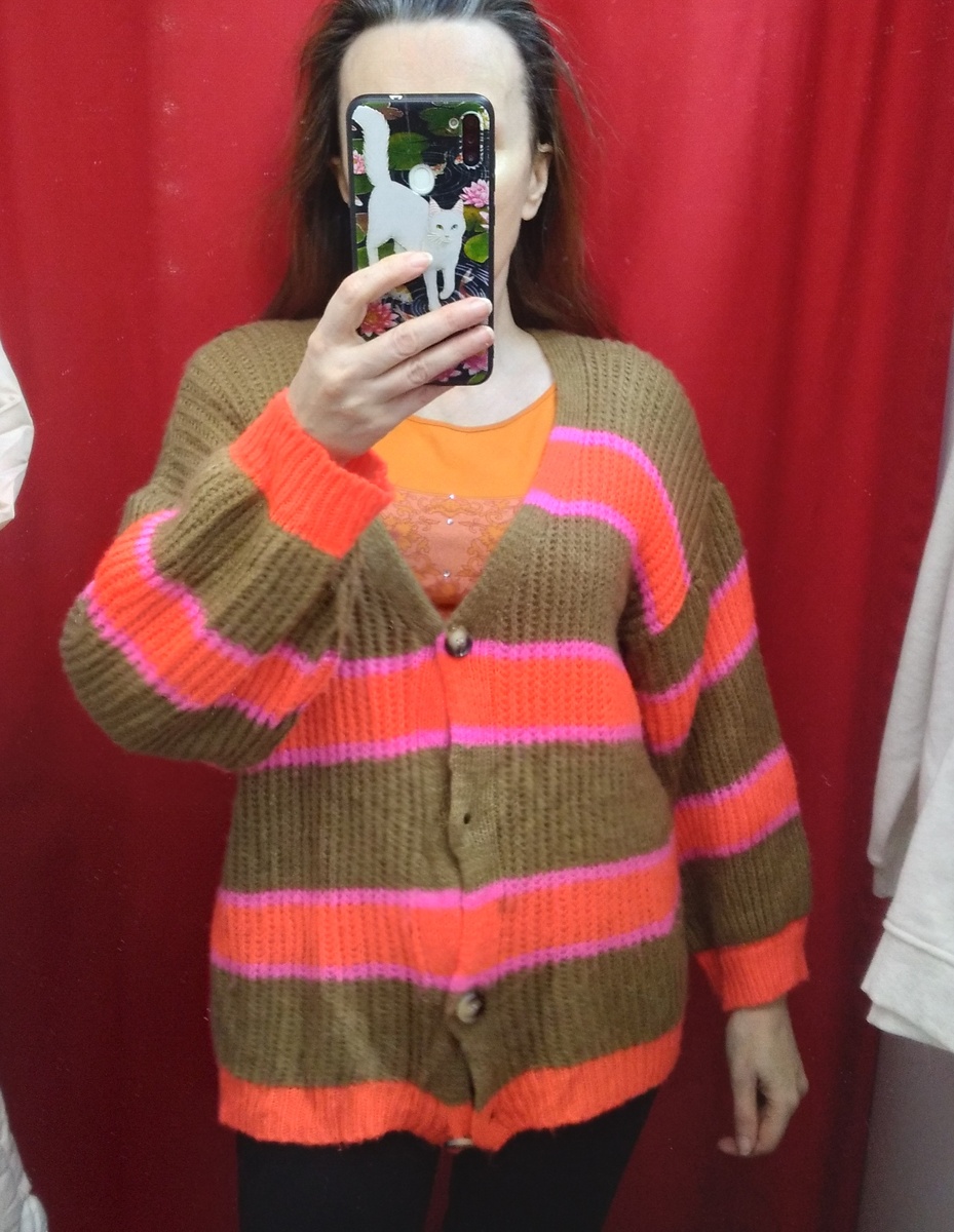 Здравствуйте, оказывается, что кот Тихон мастак нагнать страху. Сидим мы с ним вечером на кухне, он корм подъедает. Вдруг кот начинает прислушиваться, подходит к порогу кухни, замирает и начинает всматриваться и вслушиваться в темноту коридора. Несколько раз оборачивался и смотрел мне в глаза, как будто хотел сказать, что мол ты, человек, иди и посмотри, что там, а то Тишенька боится. К тому же пока тебя будут доедать, котинька успеет спрятаться. Минуты две мы переглядывались, потом кот успокоился и вернулся к миске. Я не боюсь темноты, особенно в своей квартире, но как-то неприятно. А теперь обзор из светлого и нестрашного секонда, всё можно было взять по 590 за кг. Очень мягкий и легкий кардиган реденькой вязки. Чуть мохера - вот и вся итальянская щедрость. Свитшот с капюшоном. Тоже очень мягкий, внутри гладенький ворс. Хотела взять, но много полиэстера показалось((. Хотя когда очень нравится, то я на состав не очень засматриваюсь, хороший состав идёт как приятный бонус. Очаров