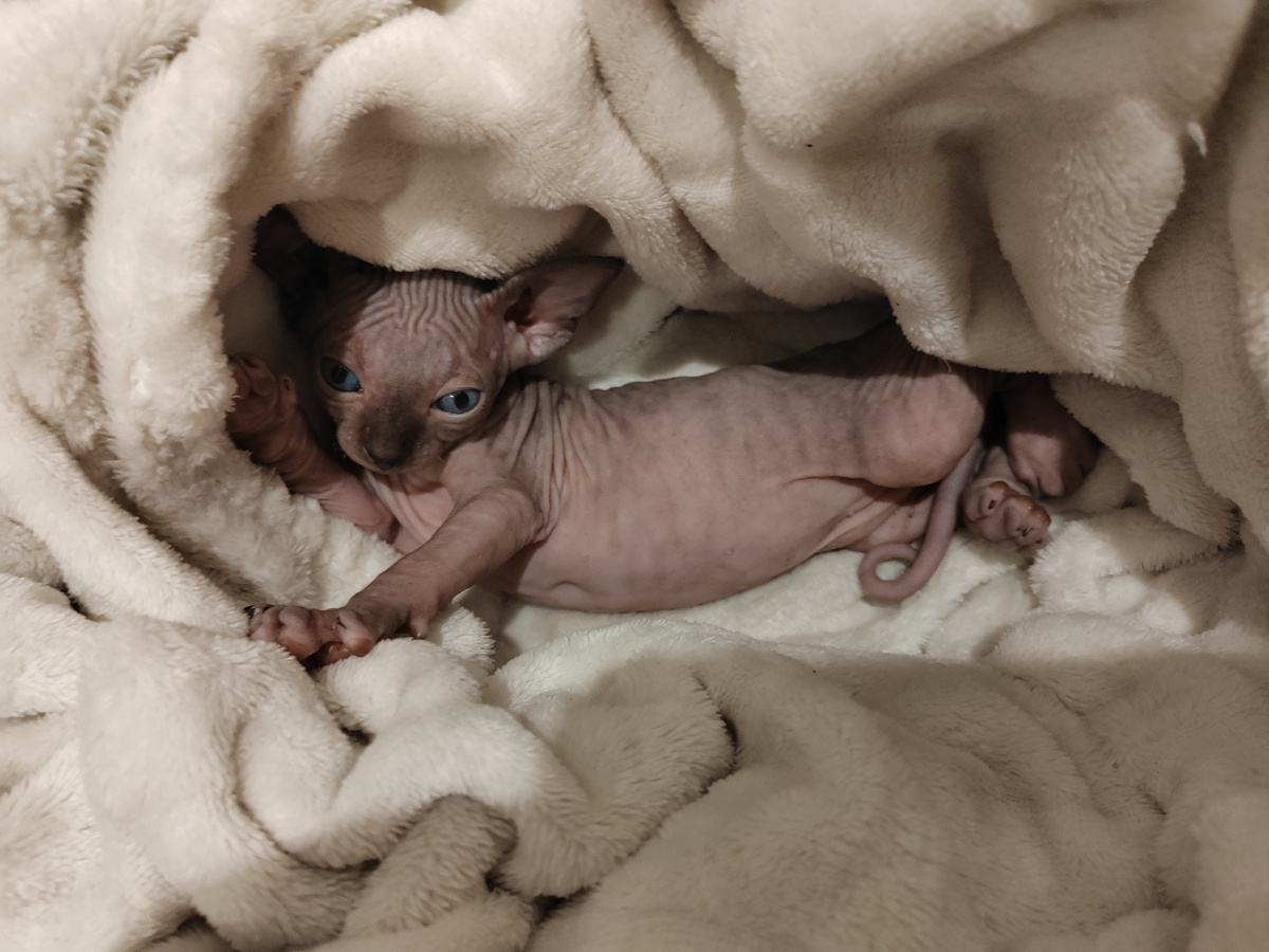 Канадский сфинкс — одна из самых необычных и экзотических пород кошек, привлекающая внимание своим уникальным внешним видом и ласковым характером. Эти кошки известны своей бесшерстной кожей, которая требует особого ухода, и их способность стать настоящими компаньонами для своих владельцев. Описание породы Канадский сфинкс отличается практически полным отсутствием шерсти. На ушах, носу, хвосте и пальцах ног могут быть короткие тонкие волоски. Тело сфинкса может быть как полностью безволосым, так и покрытым пухом, напоминающим персик или замшу. Усы короткие и редкие либо отсутствуют вовсе. Отличительной чертой породы являются большие уши, достигающие в высоту 5–8 см, и широко расставленные лимоновидные глаза. Тело сфинкса крепкое и мускулистое, с полным округлым животом. Окрасы канадских сфинксов разнообразны: от однотонных до черепаховых. История породы Первый бесшерстный котенок появился в результате генетической мутации у черно-белой домашней кошки в канадском городе Онтарио в 1966
