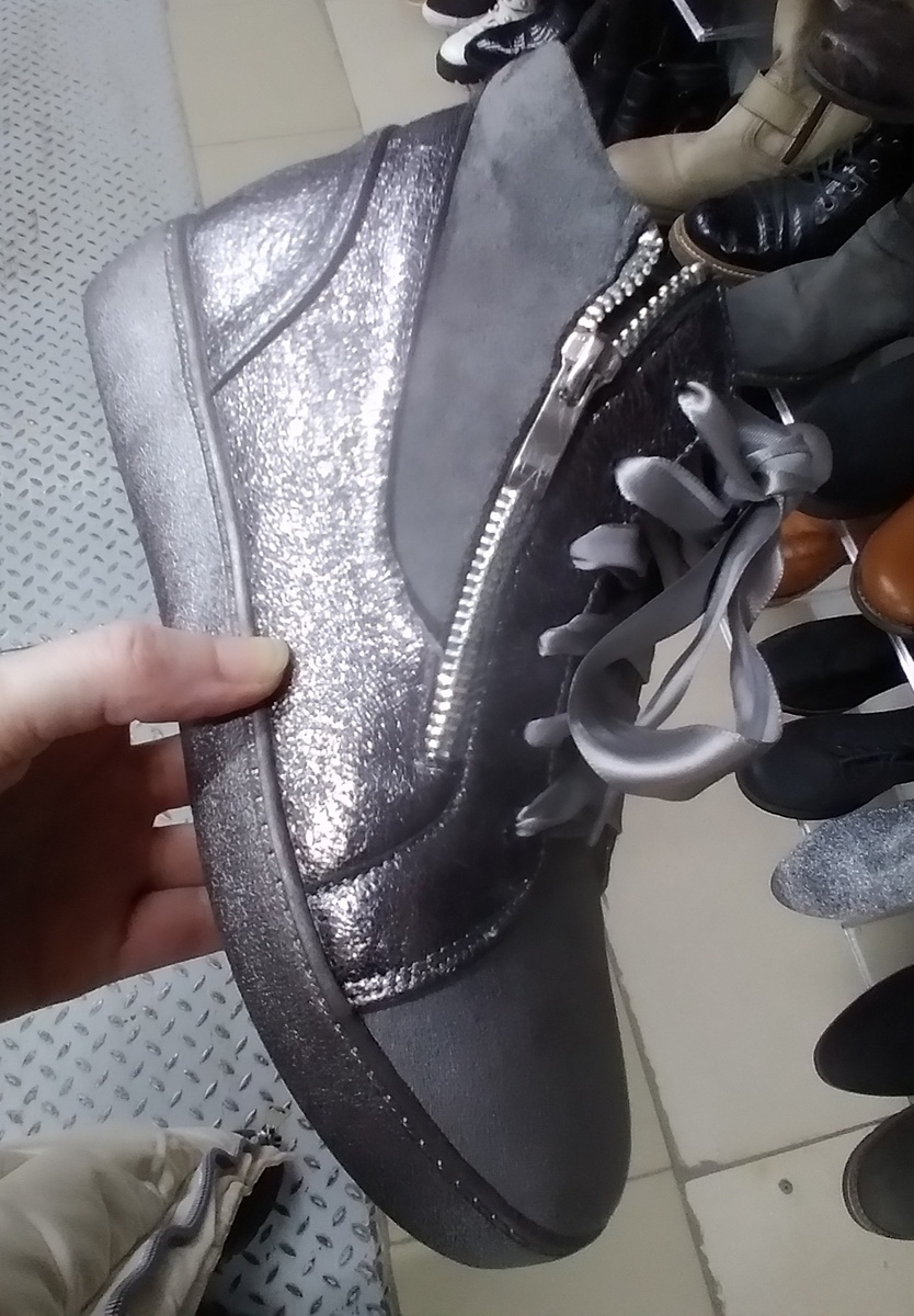 Здравствуйте, сегодня покажу обувь, 1800 за кг это уже неплохая скидка). Обуви много, несколько длинных полок, большинство заметно ношенные, я выбирала обувь поновее. Серые демисезонные ботинки с молнией и со шнуровкой, для пущей красоты шнурок заменили на ленточку и плюс серебряная отделка, такие кокетливые ботиночки). Демисезонные сапоги с широким голенищем. Смотрятся интересно, но кому они подойдут? На тонких ножках будут совсем страшно болтаться. Зато новые. Наверно, это можно назвать кроссовками. А еще снокерами. Это текстильные кроссовки, напоминающие носок с подошвой. Это один из самых удобных видов обуви, они легкие, в них не жарко и они не натирают. Из минусов только то, что, как и любая текстильная обувь они быстро пачкаются и легко намокают даже в небольшой дождь. Голубые с серебром эспадрильи на высокой джутовой подошве. Туфельки на наборном каблуке. Цвет какао, похоже на нубук, но это ненатуральная кожа. Мятые, но носились очень мало. Кроссовки со светоотражающими деталям