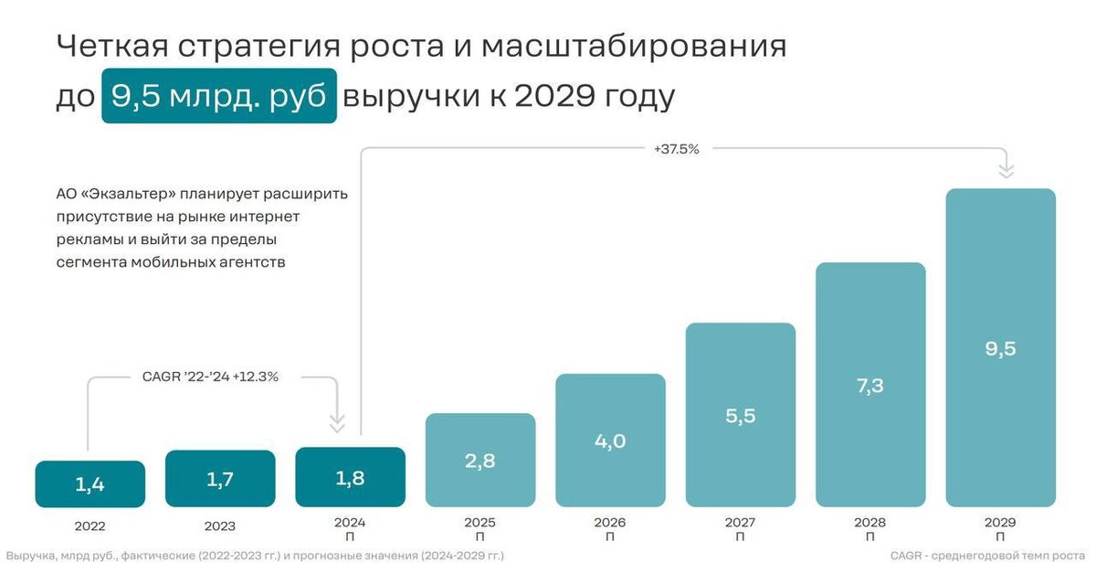 В условиях затишья на Московской бирже относительно первичных публичных размещений акций, обращает на себя внимание внебиржевая платформа MOEX Start, где быстрорастущие компании из разных отраслей экономики привлекают капитал для развития бизнеса. Участие в подобных размещениях позволяет инвесторам стать одними из первых держателей акций компаний, которые могут оказаться очень успешными в будущем. В качестве очередного участника размещения выступила Группа Экзалтер. Итак, компания занимает лидирующие позиции на рынке мобильного маркетинга, предлагая широкий спектр услуг – от создания бренда до его продвижения в онлайне. Диверсифицированный клиентский портфель включает такие известные бренды, как ЛСР, Магнит, HOFF, Мегамаркет, Вкусвилл, и др. Выручка компании в 2024 году составила 1,8 млрд рублей, при рентабельности EBITDA около 25%. Маржинальность бизнеса достаточно высокая, однако руководство нацелено на увеличение этих показателей: к 2029 году планируется достичь уровня выручки в 9,6
