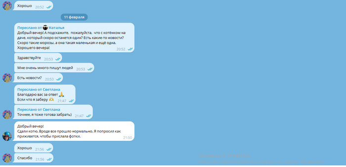 Предыдущий пост https://pikabu.ru/story/moskva_ochen_nuzhen_dom_kotenku_devochka_34_mesyatsa_pikabushnik_uletaet_13_fevralya_cherez_5_dney_ona_ostanetsya_na_dachakh_12349612 Всем привет. Вчера @Trichlorophenol отдал котенка пикабушнице. Как будут фото, он пришлет и я их выложу. Пишу тут, потому что до сих пор очень много людей мне пишет. Но я же только помогала пиаром. Я вообще в Ленобласти. Надеюсь, что все сложится хорошо. Всем большое спасибо за поддержку.
