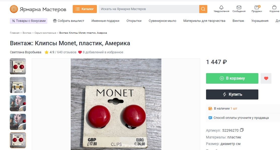 Эпизод 1 В продаже клипсы, в описании продавца есть информация, что изготовлены компанией Monet. Клипсы на фирменной подложке. Обычно, когда мы видим украшения на подложке, это означает, что вещь новая, ей почти не пользовались или не пользовались совсем. Но это не всегда так. Смотрим внимательно. Это оборот клипсов. Застежка, не характерная для клипсов от Monet. Далее, вот эта фотография. И есть еще одна фотография опять лицевой стороны. Что меня смутило? Клипсы с подложки были сняты, но полной фотографии оборотной части клипсов нет. Почему? Скорее всего, на них нет маркировки. И застежка, не характерная для клипсов от компании Monet. Вот примеры застежек клипсов от компании Monet с маркировкой. Подробно о маркировке украшений от компании Monet я уже писала. Ссылка на статью будет внизу. Часто встречается и вот такой вариант застежки клипсов с маркировкой. Что нужно делать в подобных случаях? Просить фото оборотной части. Если нет маркировки, то клипсы вряд ли изготовлены компанией M