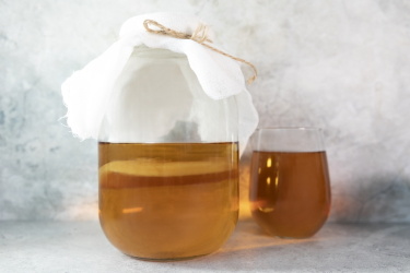 - Фрукты, ягоды или ароматизаторы разложите по ёмкостям и залейте комбучей, оставляя 5–7 см от края тары для брожения;