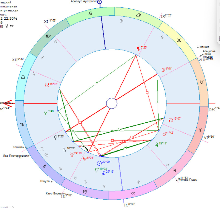 Ой, статья обо всём у меня получается. Итак, Марс. У нас по такому Марсу короткая мотивация. То есть, человек быстро зажигается, получает поток приличный и быстро потухает. Соответственно, ему желательно как можно быстрее сделать, особенно если он находится в застойном состоянии, то есть, ему в принципе ресурса не хватает в таком состоянии, а он ещё живительные импульсы игнорирует, соответственно, ещё больше уходит в застой. Кто-то, с учётом положений здесь, может предположить, что человек жёсткий и резкий: Марс в Овне, имеет секстиль с Луной в 8 доме, с Венерой трин, Луна не устойчивая, Скорпион на асценденте, Плутон в 1 доме. Но, прикиньте, человек этот не агрессивный. Почему, как думаете, не работает тут классика, которой много где учат? Из-за Луны, СУ в Овне и связями с мягкими планетами по функциям. Близнецы мягкий и подстраивающийся знак, он психологически диктует правило того будет ли человек выбирать агрессию. Он будет сначала стараться поговорить, обсудить, прийти к общему мнению. А если он накопит агрессию как он будет реагировать? Истерикой, “поймите меня, вы должны меня понять”, там у нас же Венера в оппозиции к Луне. Мягкая Луна психологически, оппозиция, которая сильнее, чем секстиль с Марсом (не забываем учитывать и силу орбиса). Тут человеку себя надо учиться защищать, он не умеет. И Скорпион на асценденте и Плутон в 1 доме вообще не спасает. Чего нам Луна в оппозиции с Венерой даёт? Жертву. Это человек, который чувствует себя ущемлённым и находится во внутреннем конфликте между функциями Луны и Венеры. Но это всё верха. Дело в том, что оппозиция оппозицией, а каждая функция планеты имеет своё место назначения. У Луны - это 8 дом, а у Венеры - это 2 дом. Для планет базово работает правило - где родился, там и пригодился. Когда у такого человека происходит кризис, его Луна начинает нервно тянуть к себе Венеру на автомате, а чем на самом деле здесь Венера является для Луны? Подспорьем. Луне нужна стабильность, которая есть у Венеры, это программа такая, программа самой карты. Через что Венера тут может дать Луне стабильность? Например, через деньги, авторитетных людей, красоту, удовольствия, желательно так, чтобы это был изысканно, с размахом, она ж в Стрельце. Но в чём косяк оппозиции самый главный - в событейке. А на событейке у человека кризис из-за чего, из-за того, что стабильность второго дома ушла. Н-р, денег нет. И если кризис Луны в какой-то момент обусловлен тем, что он по Венере лишается нужного ему ресурса, то Луна лишается своего подспорья. Возникает закономерный вопрос “Чего делать то с этим?”. Смотрим чем управляет Венера. То есть, мы отталкиваемся от той планеты, а которой проблема. Не бывает такое, что проблема в самом кризисе, проблема всегда в изначально теме кризиса, главное себя просто не обмануть в причинно-следственных связях.