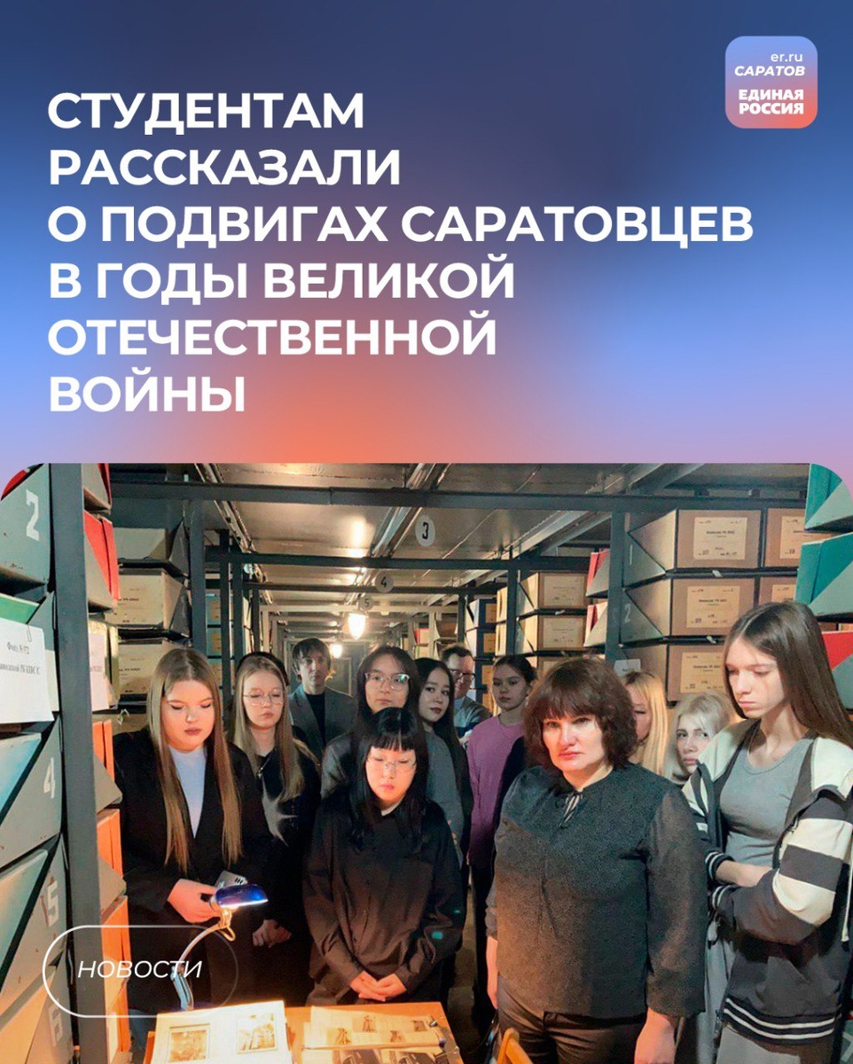 📕В рамках проекта «Историческая память» партии «Единая Россия» для студентов архитектурно-строительного колледжа состоялся исторический лекторий, который рассказывает о жизни Саратова в годы Великой Отечественной войны. На мероприятии присутствовали студенты архитектруно-строительного колледжа, депутат городской Думы Ирина Видина, местный координатор проекта «Историческая память» партии «Единая Россия» Екатерина Сокол и члены ветеранских общественных организаций. В ходе мероприятия сотрудники Архива новейшей истории Саратовской области показали гостям архивные коллекции и материалы о подвигах саратовцев в годы Великой Отечественной войны. 💬«Лекция, проведенная для студентов, отражает всю мощь исторического наследия. Молодежь должна знать о подвигах своих предков», - отметила Екатерина Сокол.
