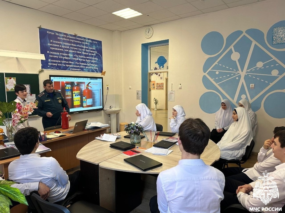 Сотрудники управления надзорной деятельности и профилактической работы ГУ МЧС России по Чеченской Республике провели урок безопасности для старшеклассников бенойской общеобразовательной школы и научили их действиям при нештатных ситуациях. Учащиеся узнали о причинах возникновения пожаров в жилом секторе и опасности выхода на неокрепший лед. Им рассказали о правилах пожарной безопасности и напомнили номера вызова экстренных служб 101 и 112. Сотрудники МЧС России научили ребят алгоритму действий при нештатных ситуациях и как правильно пользоваться первичными средствами пожаротушения. В завершении были успешно отработаны действия по учебной эвакуации.
