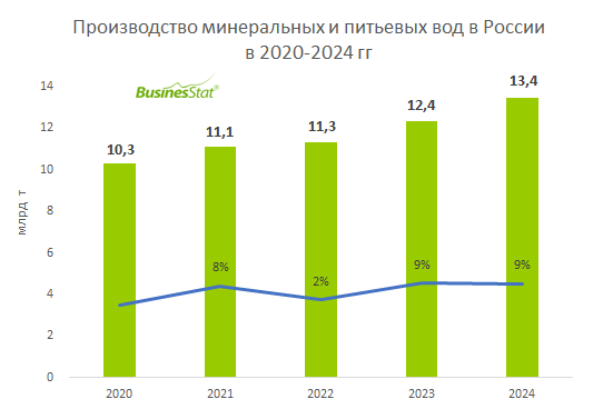 За 2020-2024 гг производство минеральных и питьевых вод в России выросло на 31%: с 10,3 до 13,4 млрд л.