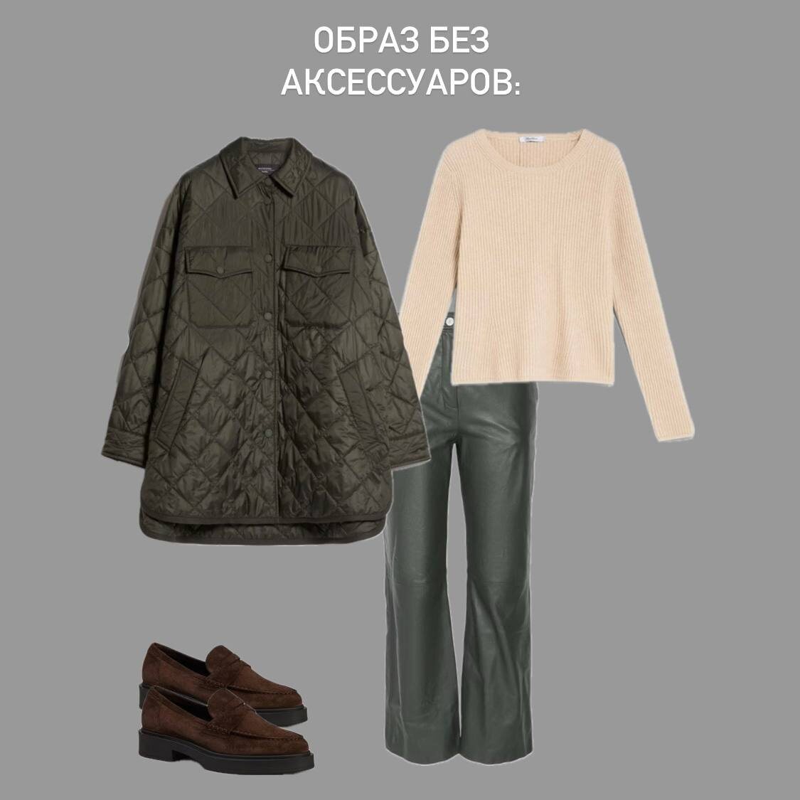 На примере аксессуары воедино собрали наш образ по цветам - шарф и ремень дублируют цвет замшевых лоферов,серьги - стеганой куртки-рубашки и кожаных брюк, а сумка из натуральной замши - свитер из кашемира в рубчик.