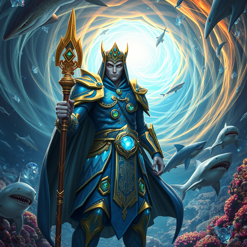 Космос шагнул в следующий зал Пещеры Зла, где перед ним находилась дверь-портал. Она светилась светом, переливаясь водными рунами. Когда он переступил через её порог, мир вокруг изменился — он оказался на дне океана, окруженный стаей акул.Вода была прозрачной, и его индиго броня ярко контрастировала с мраком океанских глубин. Акулы, кружили вокруг, их глаза горели холодным светом, а острые зубы поблескивали в темноте. Каждое их движение создавало волну течения, которые обтекали броню Космоса, но не могли сдвинуть его с места.Космос стоял спокойно, его дыхание было ровным, будто он и не заметил опасности. Он чувствовал, что этот океан был не просто водной пучиной — это была еще одна ловушка или испытание пещеры.