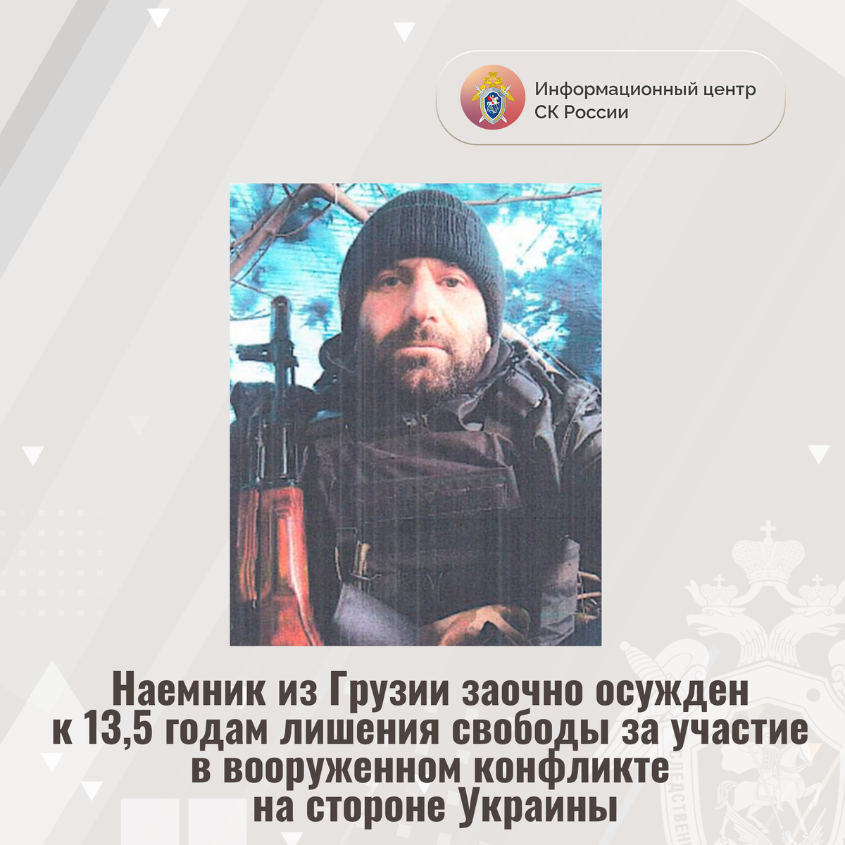 Доказательства, собранные Главным следственным управлением Следственного комитета Российской Федерации, признаны судом достаточными для вынесения приговора (заочно) гражданину Грузии Геле Беджановичу Хозреванидзе. Он признан виновным в совершении преступления, предусмотренного ч. 3 ст. 359 УК РФ (участие наёмника в вооруженном конфликте).