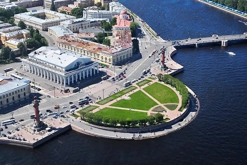 Как утверждал Ричард Мейер, «архитектура - это футбол, и в ней свои болельщики», однако он явно не осознавал всей глубины своего высказывания. Стрелка Васильевского острова в Петербурге похожа на центр футбольного поля, совмещенный с дугой штрафной площади. В свою очередь, две внутренние дорожки как бы образуют вектор атаки. Автором данного оформления был Лев Ильин, чье имя напоминает о «царе зверей», который является символом «Зенита». Согласно заявлению петербуржцев, именно это место «легло в основу эмблемы клуба». Одноименный логотип, называемый «стрелкой», был изогнутым, круглым и клиновидным; на фотографии угадываются очертания всех трех вариантов. Букву "З" также можно увидеть в изгибах набережной.