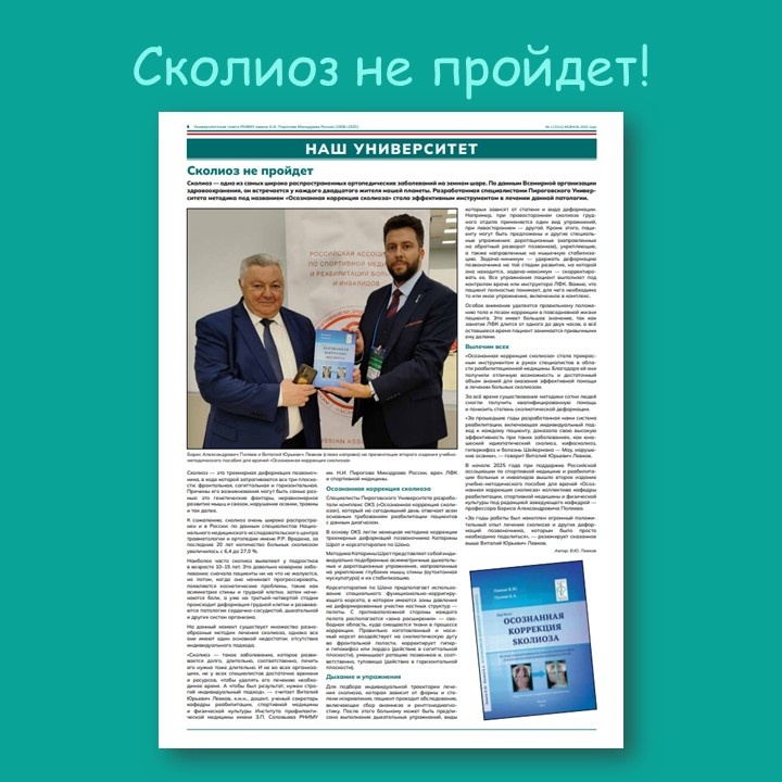 Спешим сообщить, что в университетской газете РНИМУ имени Н.И. Пирогова вышла публикация о книге нашего врача ЛФК к.м.н Шрот-терапевта Левкова Виталия Юрьевича "Осознанная коррекция SКОЛИОЗА"