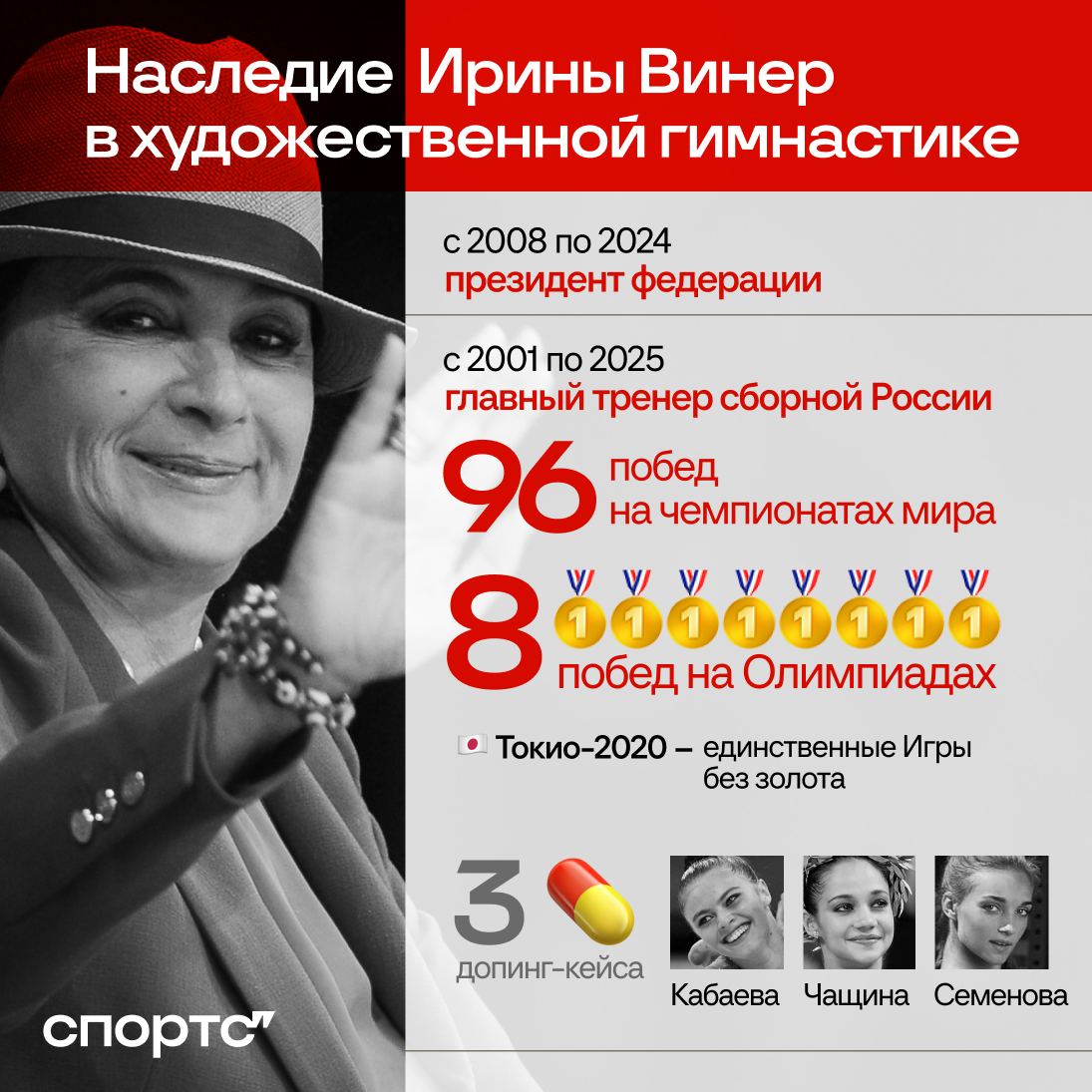 Ирина Винер ушла из сборной России по художественной гимнастике после 24 лет у руля. Чем запомните ее эпоха? Доминирование, победы и скандалы. 1. «Художественная гимнастика – моя жизнь, и я счастлива, что смогла сделать свой вклад в развитие этого прекрасного вида спорта. Тем не менее, я приняла решение уйти в отставку с поста главного тренера сборной России. Сегодня передо мной стоит новая, не менее важная задача – не просто воспитывать чемпионов, а передавать накопленный опыт тренерам, которые будут готовить будущие поколения звезд. Тем более, что многие из моих учеников уже сами стали выдающимися наставниками. Это позволит сохранить традиции нашей гимнастики и обеспечить преемственность поколений», – прощальные слова Винер. 2. Слова смиренные и кроткие, но еще год назад ее влияние казалось безграничным и бесконечным. Винер позволяла себе такие реплики в адрес спортсменов, мечтавших о Париже-2024: «Команда бомжей без флага, гимна, болельщиков поедет на Олимпиаду. Считаю унизительным,