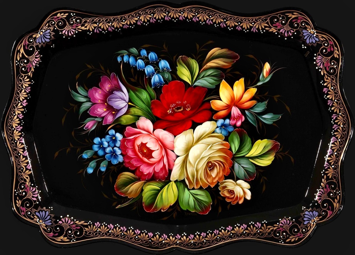 Жостовская роспись — это русский народный художественный промысел по росписи кованых металлических подносов, возникший в 1825 году в деревне Жостово Московской области. В начале XIX века сразу в нескольких деревнях и селах Троицкой волости (современный Мытищинский район Московской области), среди которых было и Жостово, появились мастерские, где расписывали лакированные изделия из папье-маше. В это же время местные мастера, братья Вишняковы, стали расписывать еще и металлические подносы. «Заведение братьев Вишняковых лакированных металлических подносов, сухарниц, поддонов, из папье-маше шкатулок, портсигаров, чайниц, альбомов и проч... существует с 1825 г.», — значилось в их прейскуранте. После революции в селе и соседних деревнях были организованы артели, в том числе Жостовская трудовая артель. Все они объединились в 1928 году в артель «Металлоподнос». В 1920–1930-х годах в жостовскую живопись пытались внедрить актуальные советские темы и сюжеты, однако художникам удалось отстоять тра