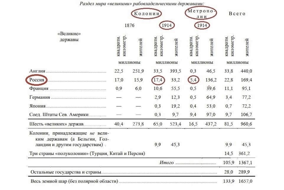Были времена, когда русские мыслители любовались бескрайними просторами России. Поразительные слова Чаадаева о Карамзине (и, собственно, о России): «Как здраво, как толково любил он своё отечество! Как простодушно любовался он его огромностью и как хорошо разумел, что весь смысл России заключается в этой огромности!» (Из письма к А.И. Тургеневу, 1837) А вот Ленин в 1914 году составил таблицу, в которой проследил динамику роста колоний у «рабовладельческих держав» с 1876 года до начала Великой войны. Из всех стран нас интересует, разумеется, Россия. Итак, вождь большевиков считал, что в 1914 году «метрополия» нашей страны составляла лишь 5,4 млн. кв. км, тогда как «колоний» у нас было на целых 17,4 млн. кв. км. Колониями Ульянов называл «захваченные» территории, которые коммунисты должны вызволить из-под «великорусского шовинизма» и тем самым воплотить в жизнь «право наций на самоопределение, вплоть до отделения». ПСС, т. 26 (1969), стр. 314. По материалам *** Заказы принимаю на мой м