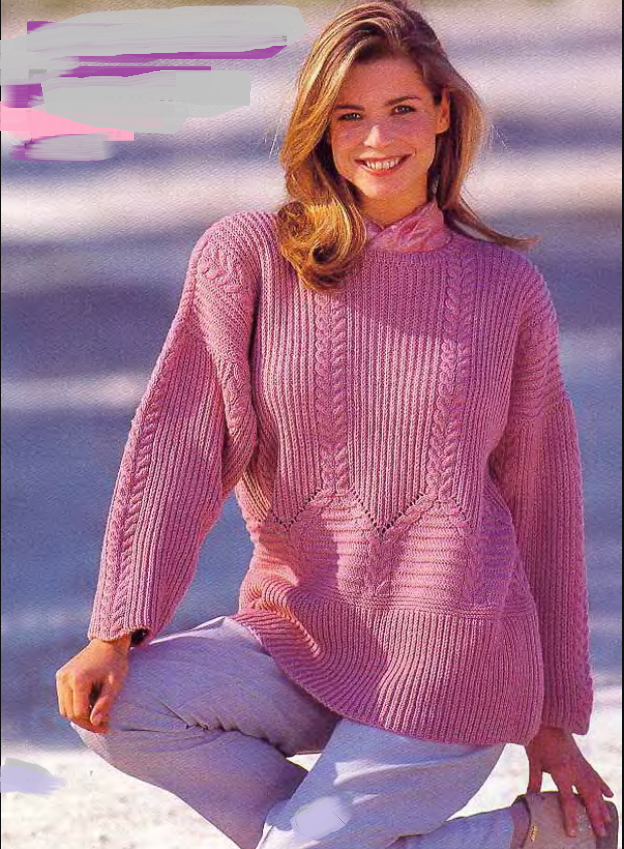Добрый день, уважаемые подписчики и гости канала! Сегодня мы начинаем серию статей, посвященных ретро-вязанию. В статьях будем рассматривать модели, которые были очень популярны у рукодельниц десять, двадцать и более лет тому назад. Вас ждут красивые обзоры незабываемых ретро-моделей, а также описания вязания и схемы узоров к ним. Обзорные статьи с ретро-моделями планируется выпускать на канале каждую неделю. Если вам интересна тема ретро-вязания, вы хотите вспомнить узоры и модные приемы вязания прошлых лет или просто хотите пополнить свою коллекцию вязаных моделей интересными идеями, рекомендуем подписаться на канал, чтобы ничего не пропустить. Ну что? Смотрим! Модель 1997 года. Красивый сахарно-розовый цвет пряжи соответствует современным цветовым тенденциям. Строгий геометрический рисунок пуловера, образованный жгутами и косами уравновешивается романтическим розовым цветом. Патентный узор придает мягкости. Приспущенные свободные проймы рукавов - дополнительный комфорт. Размер 36-38