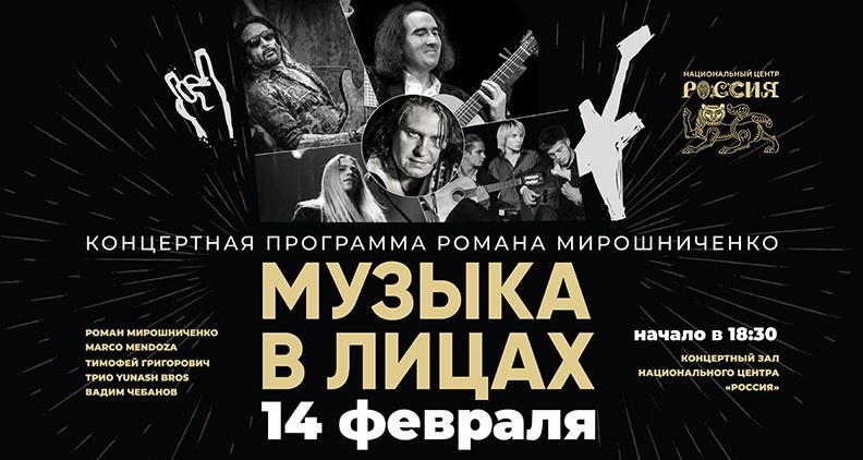 14 февраля в Национальном центре «Россия» пройдет уникальное музыкальное событие — авторская программа Романа Мирошниченко «Музыка в лицах». Это концерт-фестиваль с участием известных мировых звезд, которые порадуют зрителей выступлениями в жанрах фламенко, блюз, джаз и рок-н-ролл. Не пропустите шанс стать частью невероятного музыкального вечера! Гитарист-виртуоз и композитор Роман Мирошниченко представит свой авторский взгляд на уже знакомые композиции, а также исполнит свои собственные произведения, которые сочетали в себе джаз, рок, латино и этнику. Его выступления — это не просто музыка, а настоящий спектакль с уникальным звучанием. Концерт обещает стать настоящим музыкальным фестивалем с участием таких звезд мирового масштаба: Места ограничены, поэтому не упустите шанс увидеть это грандиозное событие. Регистрация по ссылке. Не упустите уникальную возможность увидеть Романа Мирошниченко и мировых звезд на одной сцене!