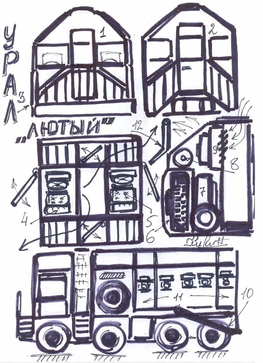 Однажды, мне попался, довольно случайно, некий призрак, который умер от рака, посте окончания их него СВО, когда я, просто рылся в ячейках, на информационном, поле одного из миров. То, что вы называете Раем, на самом деле, является "Информационным ПОЛИГОНОМ", или информационно мусорным отвалом. Дело в том, что смерть придумали люди, благодаря Религиям, и её просто не существует. Так как спираль жизни, не прерывается, и когда человек, умирает, то в новом месте, он уже практически родился, а вся хрень с 9ю, и 40 ка днями, так это для информационной сущности, с прижизненными воспоминаниями, и личным Я, которую система, и определяет в данное время в информационную ячейку, на мусорном полигоне. Так этот призрак, во время СВО, был водителем автомобиля Урал, модели "ЛЮТЫЙ". Когда я впервые в его воспоминаниях увидел Лютого, то я подумал, что это "Панорама", так называют модель маневрового тепловоза ТГМ - 6, из за его панорамной кабины (на котором я проработал длительное время и работаю сейчас), НО!, конструкторы автозавода Урал, умудрились аналогичную кабину, установить на "Авто РЕЙДЕР", АВТОРЕЙДЕР - официальное название, в тех мирах, бронированных грузовых машин, сделанных на базе машин общего гражданского пользования, для перевозки людей и грузов, в зоне боевых действий. Кабина Рейдера, спереди и сзади, абсолютно одинаковая, и при сборке на зваоде, не важно какой стороной её ставить на раму, это сделано, для быстрого ремонта кабин, после её подрыва с изменением геометрии (рисунок 1 спереди, и рисунок 2, после установки на раму). Кабина, несколько необычна внутри, так как имеет два полностью бронированных отсека водителя, с проходом по середине. Два водительских кресла 4 и 5, четыре лестницы для подъёма (рисунок 3), двери имеют петли для крепления в любую сторону, но навешиваются согласно направлению кабины. А так называемые "Курсовые Двери" (на их жаргоне), или передняя и задняя, тоже имеют систему двойного открывания, НО!, но всегда навешиваются в режиме приоритета водителя левого руля, почему, я так и не понял. То есть, оптимально левому водителю, при угрозе с лева, выскакивать, через переднюю на право, а при угрозе с лева, через заднюю на лево. Ну а водитель, правого запасного броне отделения, я так понял, там у них не в почёте. За кабиной, находится силовой броне отсек, с центральным проходным коридором. К каждой стороны, по бортам, находятся запасные колёса (рис 6), а за ними, с каждой стороны прохода, рядные - блочные, дизель генераторные установки, дизеля очень быстроходные, четырёх цилиндровые, с турбо надувом (рисунок 7). Над колесом, находится воздушный фильтр (рисунок 8), а над дизелями, находятся радиаторы охлаждения, пробовали пылесосы (двигатели воздушного охлаждения, но отказались), Воздух забирается с верху через решетку в крыше прохода, и выводится на ружу, но при задымлении кузова, или кабины, или после химической атаки, их продувка, происходит так же системой охлаждения дизелей, когда один работает вытяжкой с кабины, а другой с кузова. Так же, в зимнее время кузов и кабина в аварийном режиме, отапливаются вентиляторами охлаждения радиаторов, при правильном открытии дверей и заслонок. Машина имеет восемь мотор - колёс, с большой гарантией пробега, и очень крепкой конструкции. В бронированном кузове, имеется четыре откидных трапа, по два с каждой стороны, рисуно