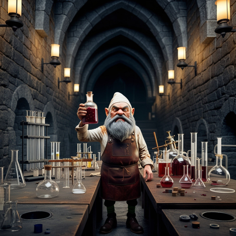 Лаборатория располагалась в полуподвальном помещении замка. Её каменные стены были увешаны искусными гобеленами с изображениями великих сражений прошлого. Огромный сводчатый потолок освещался восковыми свечами, установленными в настенных канделябрах. Массивный дубовый стол со множеством подтёков и разводов стоял посередине зала. На нём были расставлены всяческие стеклянные мензурки, пробирки, колбы, стаканы, бронзовые ступки с пестиками, металлические щипцы, шпатели, горелки и множество других странных предметов.