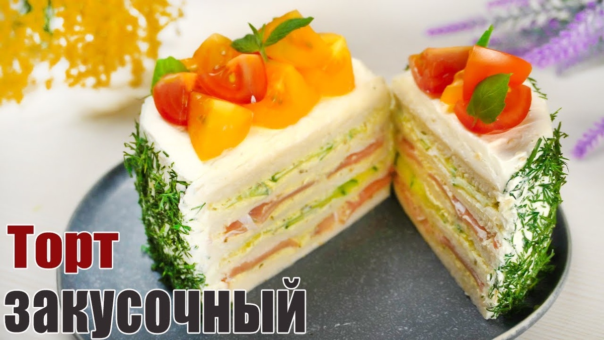 Всем привет! С вами снова Катя Паприка. Сегодня мы с вами будем готовить только очень интересный закусочный торт, который просто вот идеально подойдет для ваших праздничных застолий. Подается это в форме такого красиво украшенного тортика, потом делится на порционные кусочки и все остаются довольными. Причем я лично буду делать такой маленький вариант, все-таки пощадите меня, я это в данный момент ем совершенно одна. Но я сейчас вам покажу, как сделать так, чтобы это был прям такой большой торт на большую компанию. Сегодня нам понадобится: (я напишу на свой маленький тортик, диаметр на 1 тостовый хлеб) соус: для подачи: Слои будем делать из тостового хлеба. Срезать корочку и выложить 4 квадрата и дальше подрезать уже под ширину вашей формы. Собирать лучше прямо в кольце, чтобы схватилась и держала форму. А я буду делать в маленьком кольце. Формочкой для салата вырезаем круги. Я буду делать 5 слоев высотой, вы выбирайте сами. В качестве соуса будем использовать мягкий творог, в кото