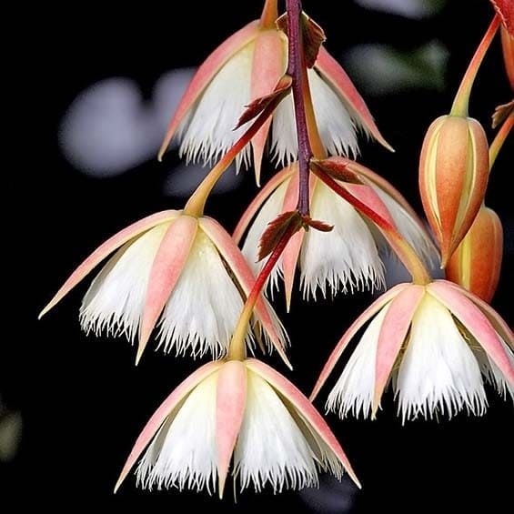 Цветение элеокарпуса грандифлора потрясающе по своей красоте, изяществу и нежной окраске и необычной форме цветков. Цветки собраны в соцветия. Сам цветок – как белая перьевая юбка балерины. Прицветники розовые разных оттенков, до самых насыщенных. Прицветники – будто затейливая верхняя юбка балеринки, заботливо обрамляют белый нежный колокольчик цветка