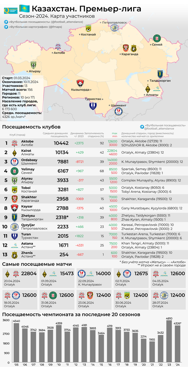 Также «Кайрат» и «Актобе» собрали наибольшую аудиторию на одном отдельно взятом матче в прошедшем сезоне (22804). Это вы могли увидеть в одной из предыдущих записей канала. Также в архиве моего канала вы можете найти мои поездки в Актобе (https://t.me/football_attendance/250) и Алматы (https://t.me/football_attendance/264) двухлетней давности, где было очень ярко и динамично!