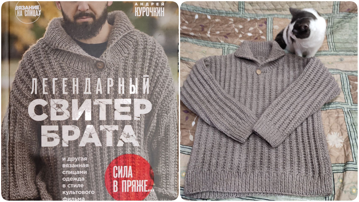 Чуть больше недели работы и свитер "брата" готов. Вязала по описанию Андрея Курочкина. Обычно я вяжу плечевые изделия регланом сверху или круглуой кокеткой, а тут сшивное, да ещё по описанию. Но хотелось проверить себя и я видела, что сыну очень хочется такой свитер. В общем, всё получилось. Не скажу, что мне понравилось вязать отдельными деталями и потом сшивать. Но результат стоил того. Вязала из Ализе Лана Голд в две нити на спицах номер восемь, резинки на шестёрке. Ушло десять с половиной мотков. Основное полотно польской резинкой. После ВТО вытянулся в длину немного. Получился очень тёплый.