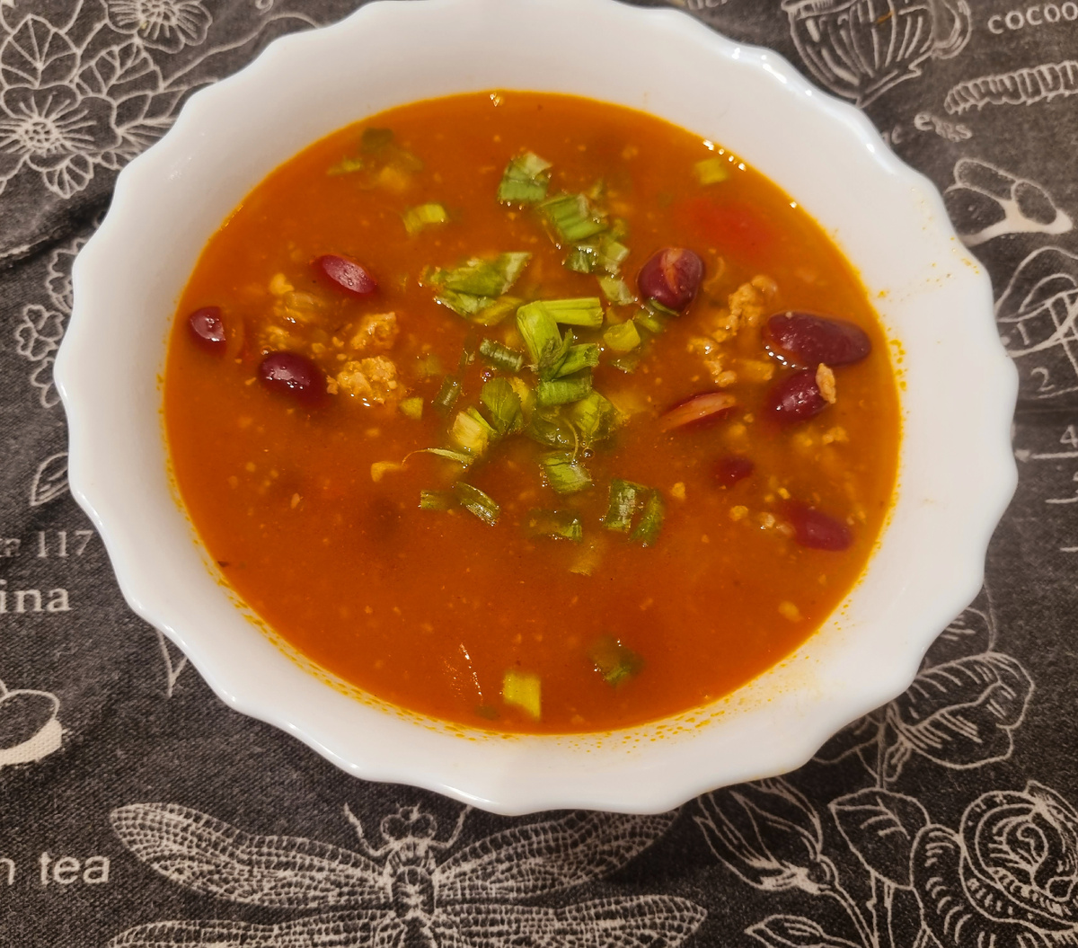 Получился относительно лёгкий, кисленький супчик. Нам понравилось. Хотя делала впервые, но повторять буду) Ингредиенты: 300 г фарша 1 болгарский перец 1 средняя луковица 1 банка красной фасоли (ну или так отварной) Полбанки помидор в собственном соку 1 ч.л. паприки 1 ч.л. сухой аджики 2 зубчика чеснока Соль Зелень для подачи Лук мелко режем. Обжариваем на медленном огне. Добавляем к нему фарш и обжариваем до побеления фарша и выпаривания из него жидкости. Добавляем порезанный полосками болгарский перец, обжариваем немного вместе, добавляем помидоры и тушим минут 10. Вливаем бульон и высыпаем фасоль. Варим минут 20. Добавляем пропущенный через чеснокодавку чеснок, накрываем крышкой, отключаем огонь и даем настояться немного. Перед подачей посыпаем зеленью. Я ела со сметаной))) Ну вот и всё. Относительно быстрый рецепт.