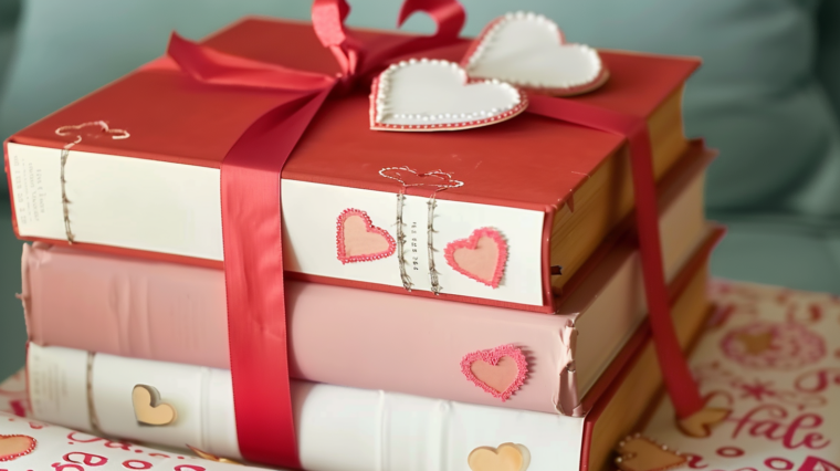 Нужно каждую книгу упаковать в бумагу, а затем приклеить различные сердечки с надписями. Декор на День влюбленных станет еще оригинальнее, если вы перевяжете стопку книг лентой. Можно добавить личные пожелания, стихи или даже небольшие рисунки сверху стопки.