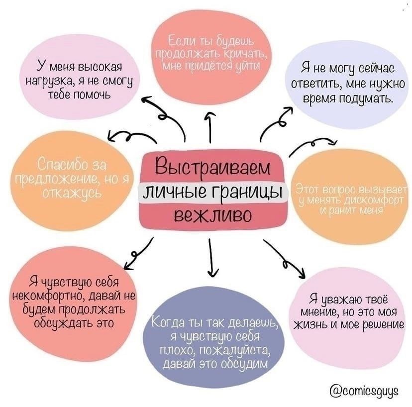 Я делаю свое дело, а ты делаешь свое дело. Я живу в этом мире не для того, чтобы соответствовать твоим ожиданиям, И ты живешь в этом мире не для того, чтобы соответствовать моим. Ты — это ты, а я — это я, И если нам случилось встретить друг друга — это прекрасно. А если нет — ничего не поделаешь. Ф.Перлз Недавно нашёл классную картинку на просторах интернета. Многие люди, которые долгое время никак не защищали свои личные границы, верят, что если выстраиваешь личные границы, то становишься злым, плохим или обижаешь других людей. Личные границы — это здоровые барьеры, которые отделяют нас от других. Выстраивать личные границы, в частности, значит: осознавать своё Я; научиться идентифицировать и понимать глубинные и сиюминутные эмоции; выбирать взаимовыгодные коммуникации; доверять себе и своим ощущениям; различать свои и чужие потребности и ценности. На самом деле границы можно отстаивать достаточно вежливо, и обычно это никого не задевает. Если вы вежливо попытались выстроить свои гран