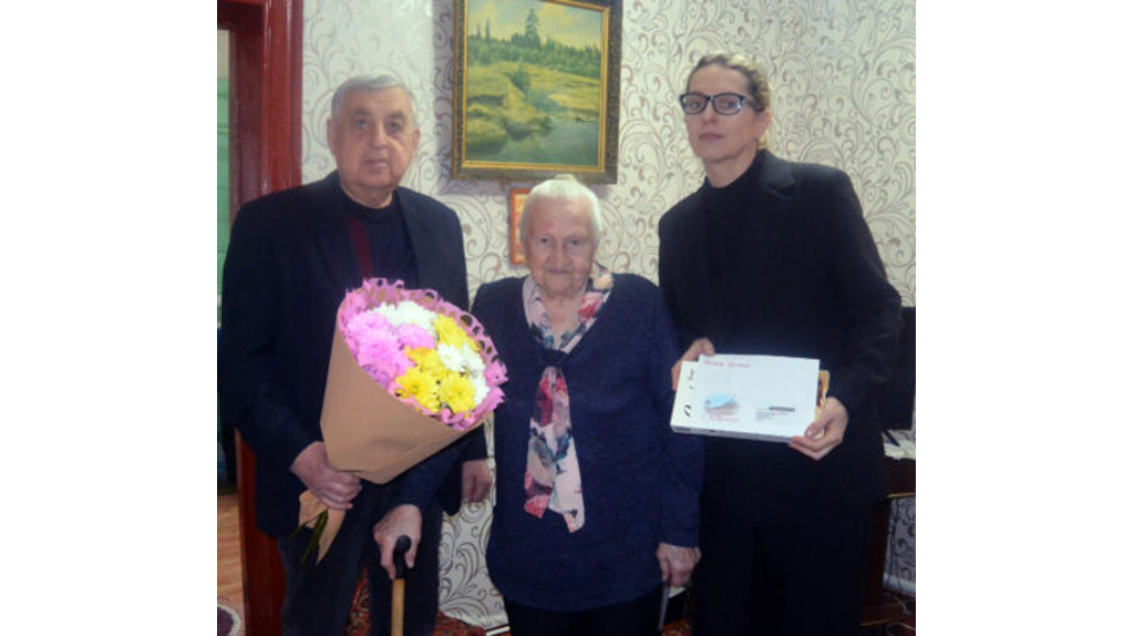 Гости вручили персональное поздравление от Президента Путина, цветы и сладкий подарок. Александру Федоровну поблагодарили за многолетний труд, ей пожелали здоровья, семейного благополучия и оптимизма.
