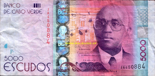 5000 эскудо. Аристидиш Мариия Перейра (1923-2011). Государственный деятель. Аристидиш Мариия Перейра – государственный деятель. Разбирая его биографию, постоянно приходится проводить аналогия с многими современными романами, где герой с самой низкой стартовой позиции, с самой первой ступени социальной лестницы, пробирается наверх... Он родился в многодетной семье. Не то чтоб «между молотом и наковальней», но близко к этому – папа у него был священник, а мама- простая крестьянка. Учился, получил специальность телеграфиста и начал работать по специальности. Образование не особенно и большое – всего лишь что-то вроде нашего техникума, но голова у человека явно варила, да и любовь к Родине для него было не пустыми понятием. Он знакомится с людьми, которые в подполье борются за освобождения страны от колониализма и становится частью этого движения. Это люди левых убеждений, марксисты. В 1956 году он принимает участие в создании «Африканской партии независимости Гвинеи и Кабо-Верне». Партия