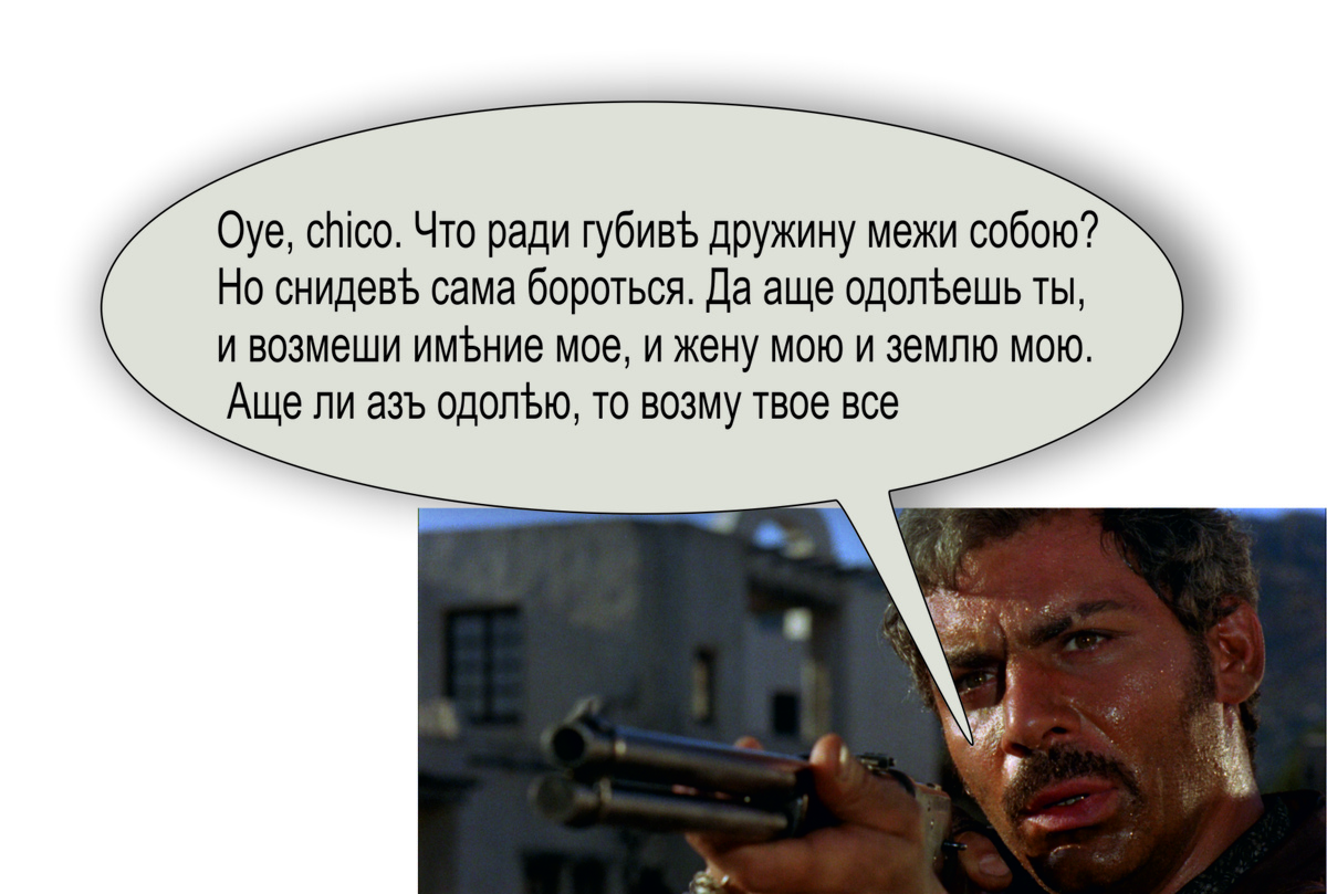 Единственно, у нас с блестящим исполнением не очень. Кругом некрасивые, косматые варвары, не знающие рыцарского копья. Придётся с коняшек слезть, а заодно отбросить оружие. Посконно, домотканно, и, главное, такое уже бывало лет с тридцать тому. Когда Ян Кожемяка вырвал у печенега кусок кожи с мясом, тьфу... сначала у быка, за ради проверки.