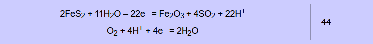 2FeS₂ + 11H₂O – 22e⁻ = Fe₂O₃ + 4SO₂ + 22H⁺