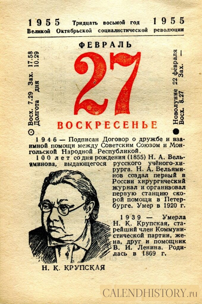 Итак, сегодня 27-го февраля и у нас на календаре 1955-й год. Перед нами листок советского календаря Политиздата. На календаре у нас воскресенье - 27 февраля 1955-го года. Н. К. КРУПСКАЯ 1946 — Подписан Договор о дружбе и взаимной помощи между Советским Союзом и Монгольской Народной Республикой. 100 лет со дня рождения (1855) Н. А. Вельяминова, выдающегося русского учёного-хирурга. Н. А. Вельяминов создал первый в России хирургический журнал и организовал первую станцию скорой помощи в Петербурге. Умер в 1920 г. 1939 — Умерла Н. К. Крупская, старейший член Коммунистической партии, жена, друг и помощник В. И. Ленина. Родилась в 1869 г. *** Оборотную сторону листка этого календаря можно посмотреть у нас по ссылке на сайте. Другие листки советских календарей смотрите у нас на сайте - CALENDHISTORY.ru ПОСМОТРИТЕ ЕЩЁ ЛИСТКИ ОТРЫВНЫХ КАЛЕНДАРЕЙ: