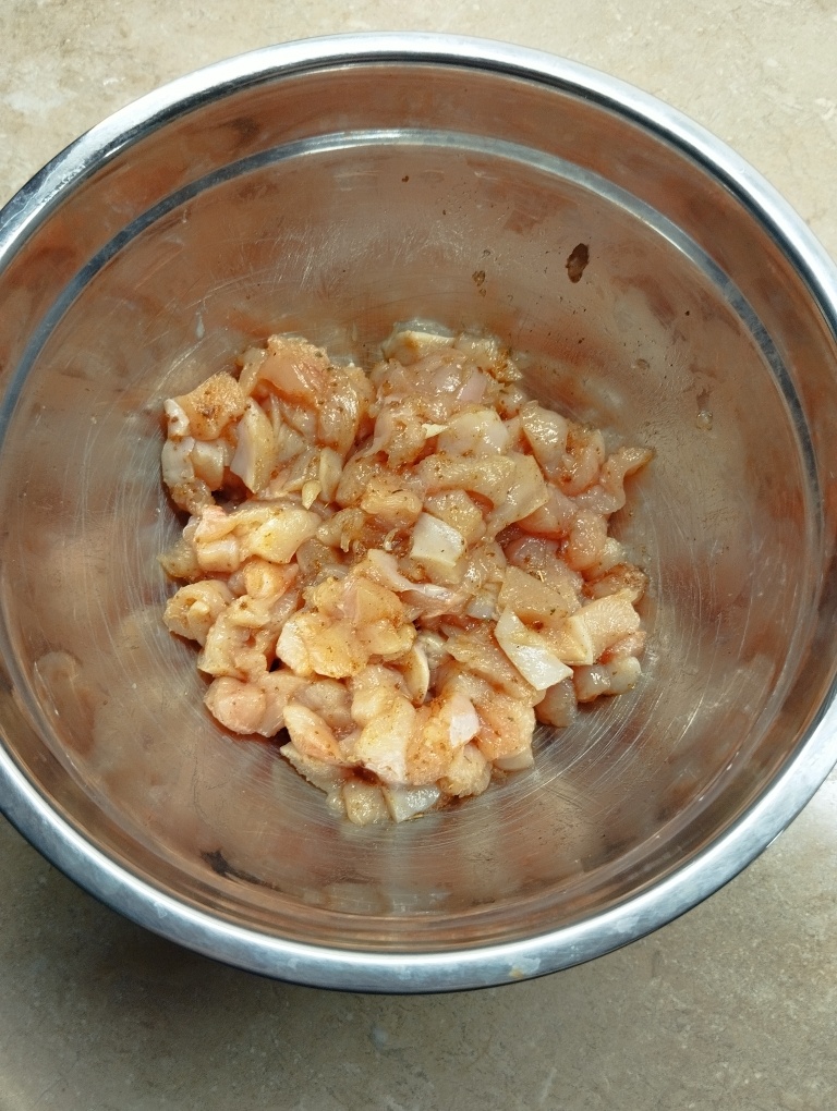В этот раз я добавила тертый картофель, и, наверное, их можно назвать драники с курицей. Но в любом случае, получилось вкусно, независимо от названия. У меня было два небольших куриных филе. Я добавила натертую на терке луковицу и три небольших картошки. Но для начала надо нарезать филе на небольшие кубики, добавить соль и специи и пока отложить промариноваться. Лук и картошку трем на крупной терке. Добавляем майонез или сметану, пару столовых ложек. Одно яйцо. Размешиваем. Добавляем пару столовых ложек муки, пол чайной ложки разрыхлителя. И можно жарить. Сначала на сильном огне я обжариваю оладьи с двух сторон, потом нагрев уменьшаю и оставляю готовиться по 4-5 минут с каждой стороны. Курица должна быть полностью готова, тесто между кусочками становится плотным. Я сделала сметанный соус с чесноком и укропом, но и сами по себе оладьи хороши.