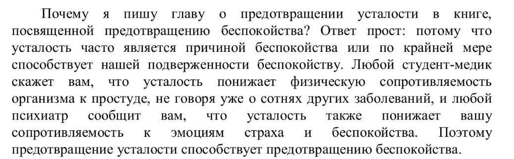 Эта книга посвящена методам борьбы с усталостью и неврозом. Хотя практической пользы от неё ждать не стоит, она помогает лучше понять себя и свои ощущения. Автор приводит множество примеров из жизни известных людей, которые преодолели трудности на своём пути к успеху. В конце каждой главы содержится краткий вывод — своего рода «выжимка», которую можно применить на практике. Книга будет полезна каждому, кто запутался в себе и испытывает тревогу по разным поводам. Она поможет навести порядок в мыслях и повысить продуктивность.
