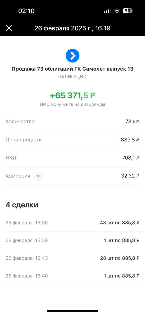 Зафиксировал часть облигаций самолет в плюс 13000 ₽. Покупал в декабре 2024 года. Было 123 шт средняя 698.3 ₽ Продал 73 шт по цене 885.8 ₽ Пока деньги припарковал в ВИМ-Ликвидность. Думаю не стоит жадничать и так хорошо заработал. За пару месяцев это очень хорошая прибыль. Чтобы вы понимали некоторые люди покупают ОФЗ и ждут целый год, чтобы получить аналогичные купоны. ОФЗ 26238 - нужно купить примерно на 150 к и продержать год, чтобы получить 16 к. Плюс у меня еще осталось 50 облигаций ГК Самолет выпуск 13. Пока не продаю, подожду вдруг получится продать дороже. Самая главная причина продажи этой бумаги была не в получении прибыли. Заработок это хорошо. Но я слишком набрал большую позицию по Самолету почти 40% от портфеля. Сейчас сократил до 50 шт. И доля на брокерском счёте теперь составляет 16%. По фэн-шуй её вообще нужно было сократить до 5-10%. Так как рейтинг сейчас у этой компании невысокий 🅱️🅱️🅱️. Хотя Тинек почему-то в своём приложении ставит рейтинг Высокий! В его пони
