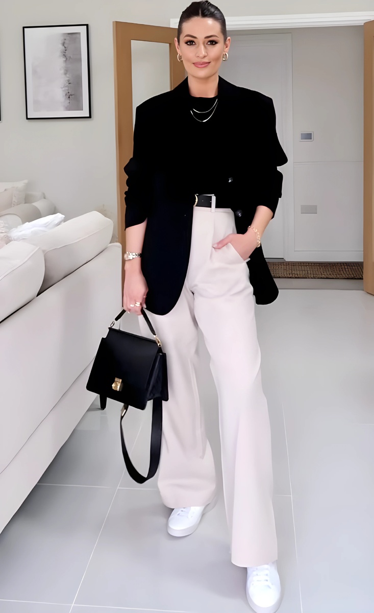 Длина пиджака тоже имеет значение. Выбирайте модели до середины бедра или чуть ниже — такой силуэт хорошо работает и с юбками, и с брюками.