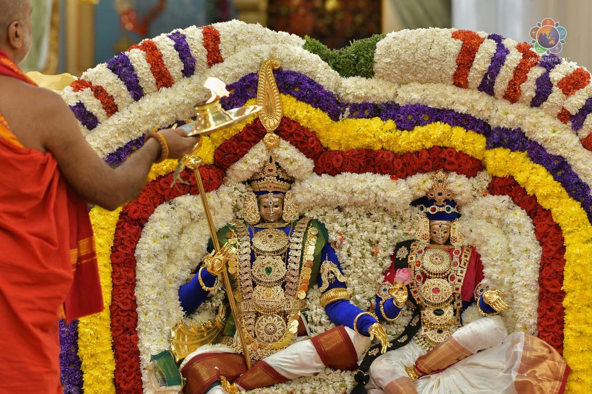 ✨Насладитесь Божественной атмосферой Прашанти Нилаям Новости Прашанти Гаури Шанкара Вивахам. Ати Рудра Маха Яджна. 24 февраля 2025 г. Священная атмосфера Саи Кульвант Холла резонировала с духовным пылом огромного числа преданных искателей, которые собрались в ожидании предпоследнего дня в высшей степени освящающей Ати Рудра Маха Яджны. Атмосфера была заряжена божественной энергией, когда ведические песнопения, исполненные в завораживающем стиле джугалбанди во время Крамарчана и Аштавадхана Севы, разносились по залу. В центре этого священного пространства стоял внушительный Саишвара Лингам, украшенный великолепными гирляндами шафрана, белого и зеленого цветов, а почтительные подношения обогащали святость ритуалов. Рядом с сияющим Саишвара Лингамом, на прекрасно украшенной платформе размещались очаровательные золотые идолы Господа Шивы и Богини Парвати, царственно восседавшие на своих тронах. Украшенные ослепительными драгоценностями и густыми, очаровательными гирляндами фиолетовог